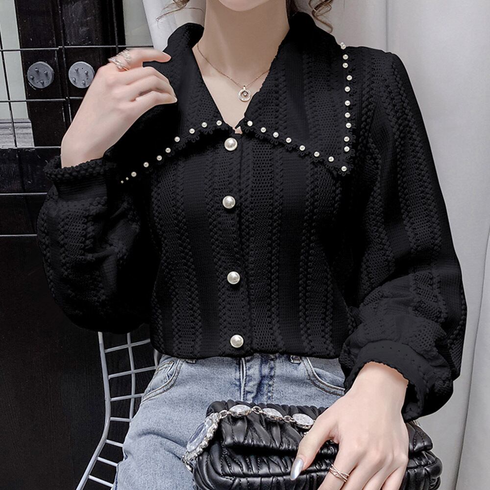 大きな襟とあしらったフェイクパールがポイントになったブラウス