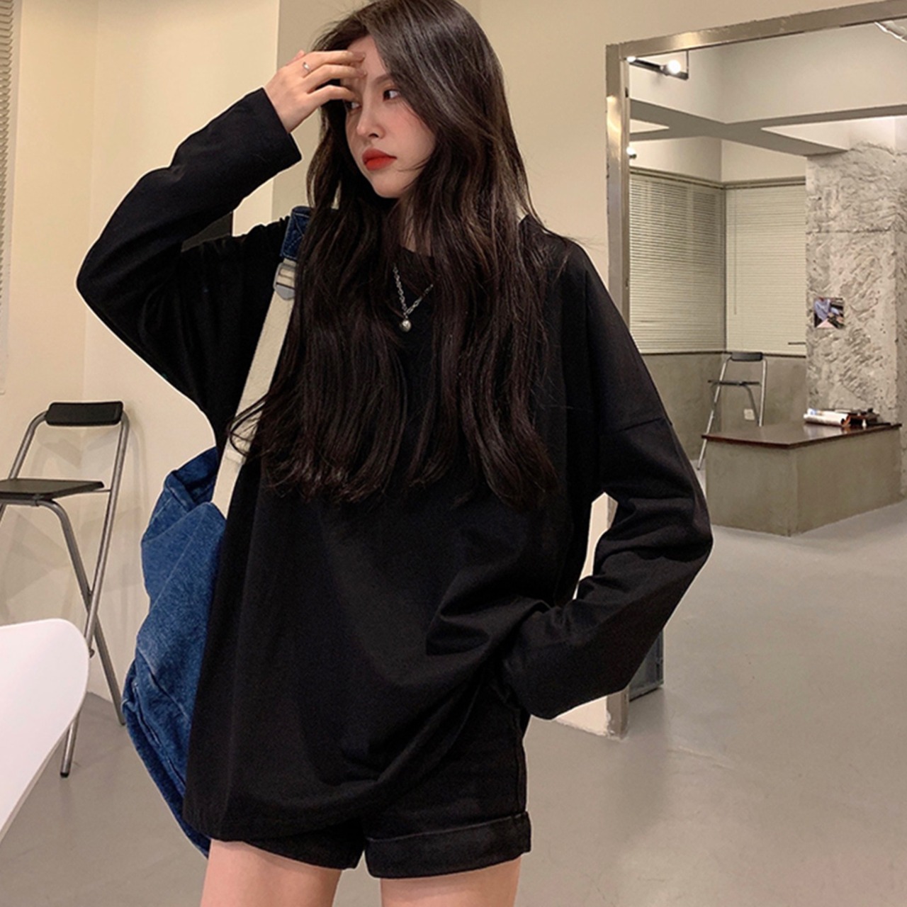 ゆったり 着やせ 長袖プルオーバー 韓国 ファッション おしゃれ カットソー 無地 Tシャツ体型カバー カジュアルトップス ラウンドネック