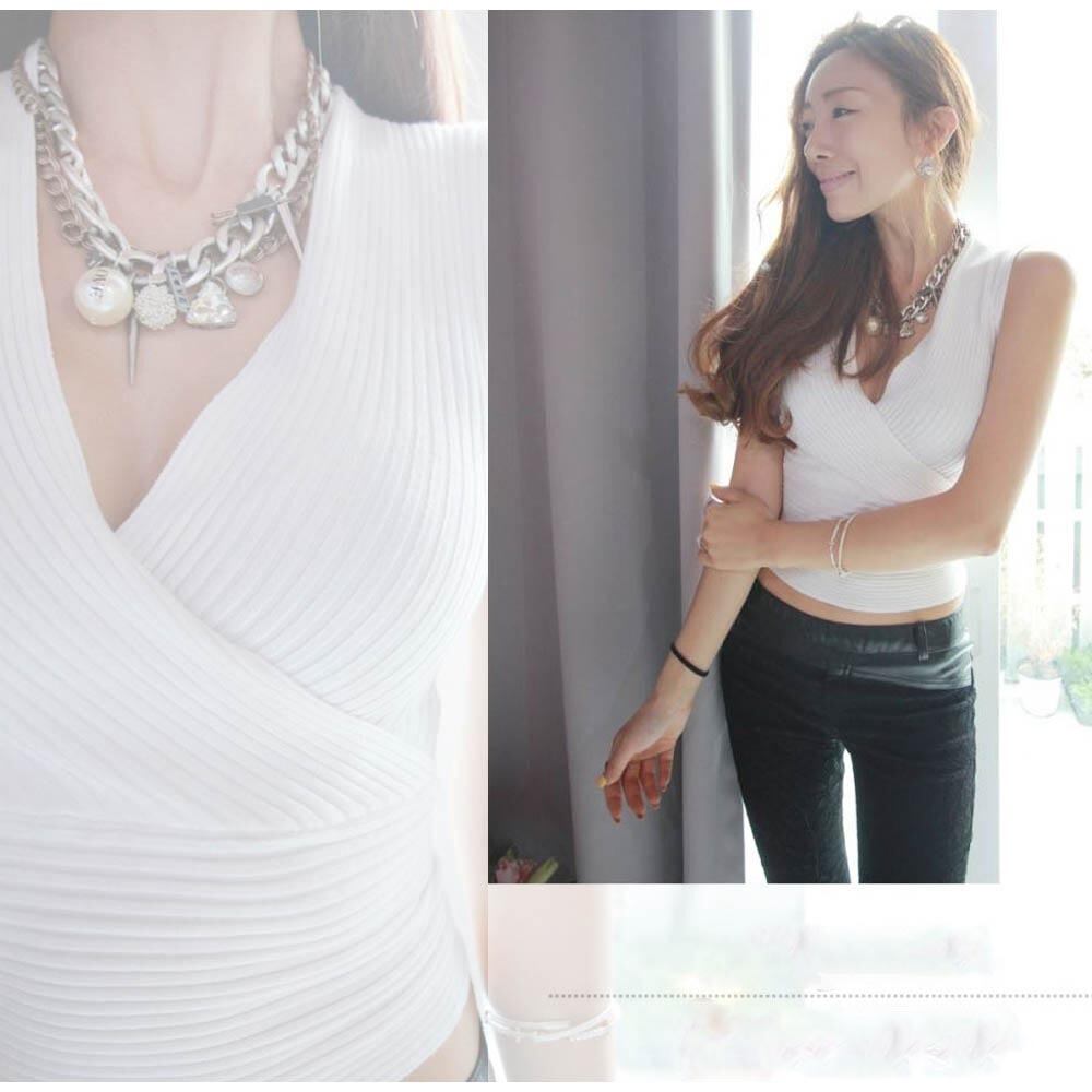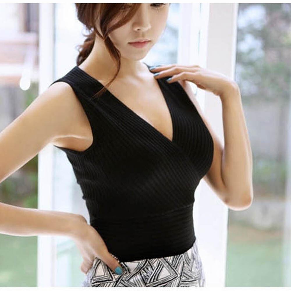 レディース クロップド丈 ノースリーブ ニットカットソー 着やせ セクシー胸元 カシュクール風 ニットウェア 春秋夏